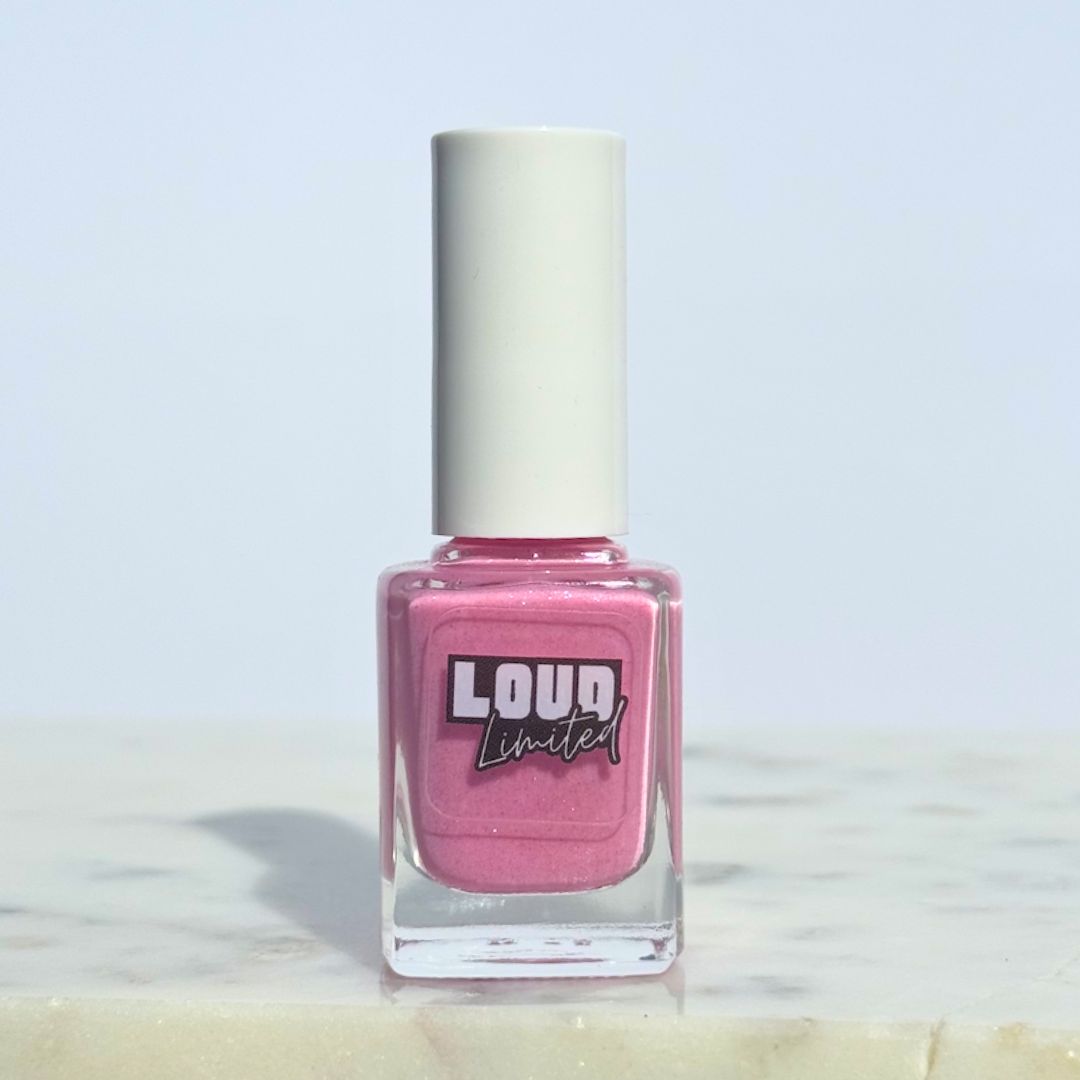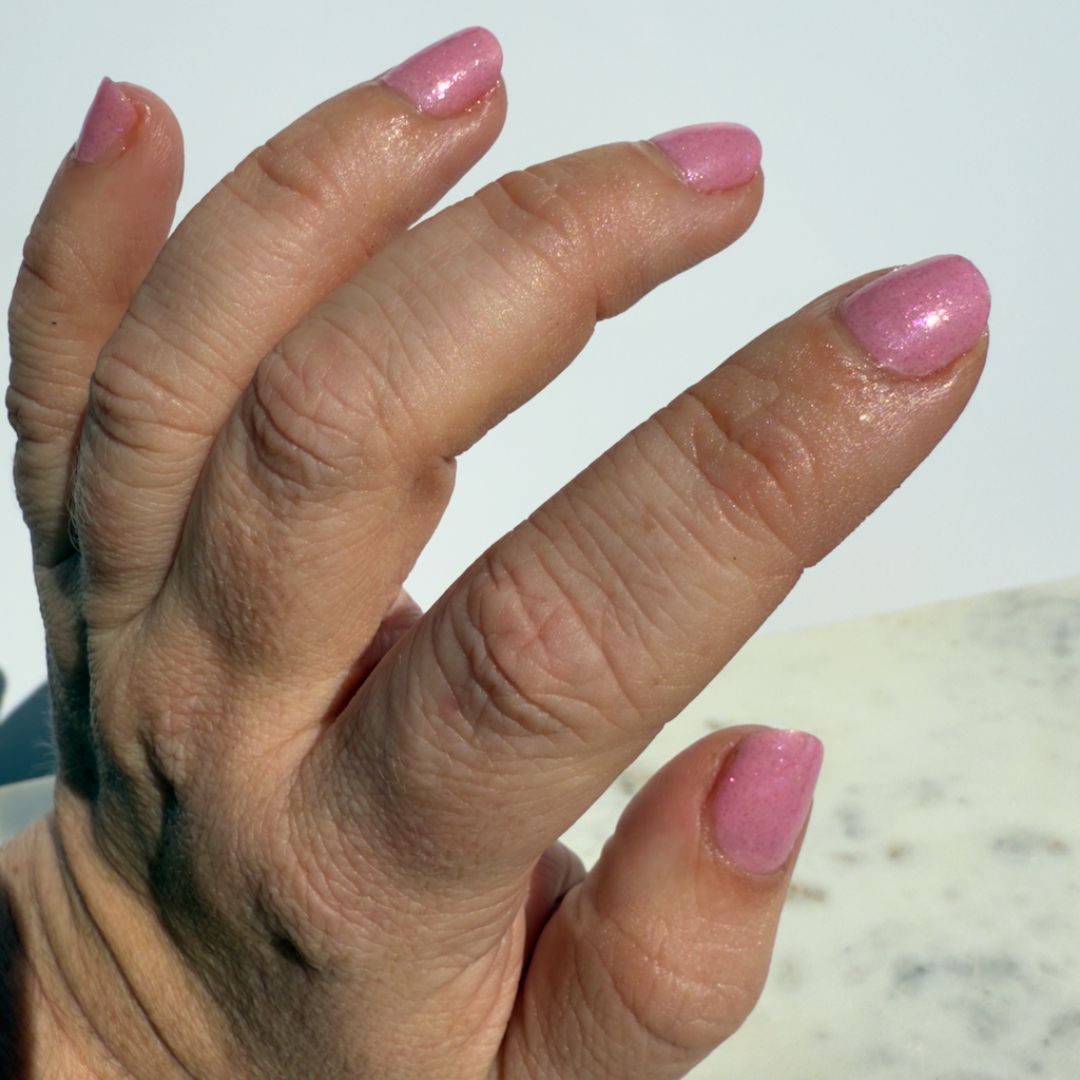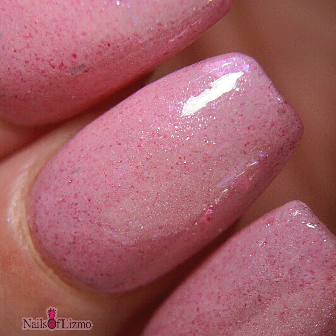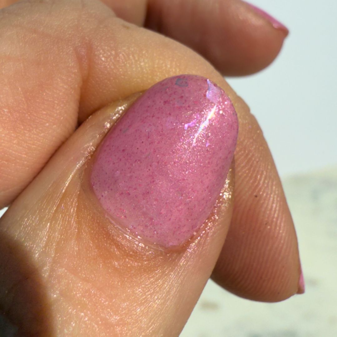 A soft blush pink crème packed with pink metallic micro flakes, chrome shimmer, pink reflective glitter, and aurora flakies—because who doesn’t love a little extra sparkle?