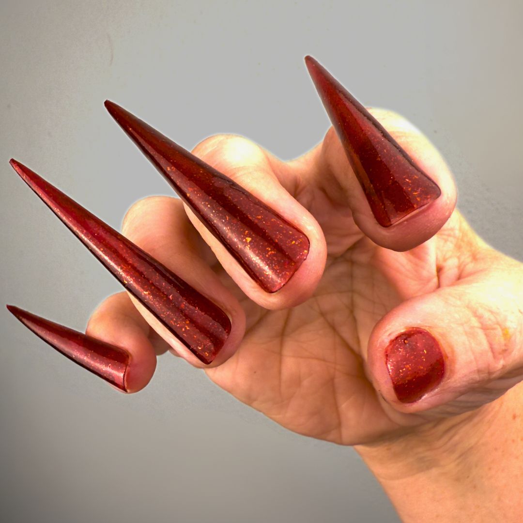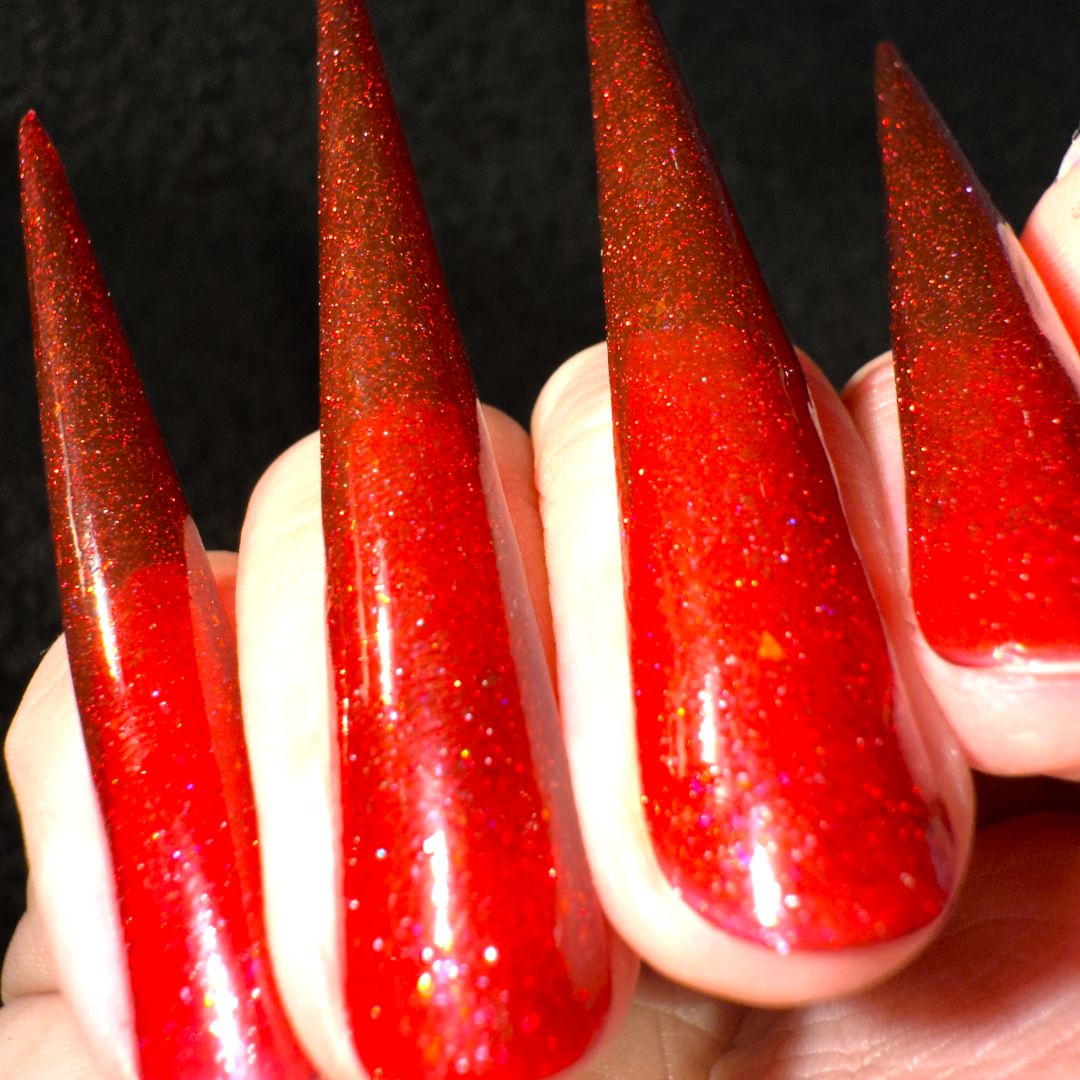 Inspired by all the glitter I've inhaled while whipping up nail polish, this blood-red jelly is a killer combo of red reflective glitter, holo glitters, iridescent flakies, and gunmetal micro flakes. It’s the only report that sparkles as much as the mess I've made—your nails will be to die for!