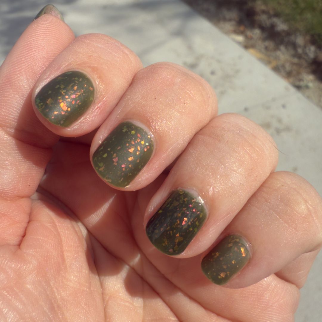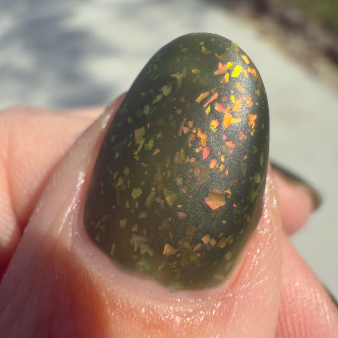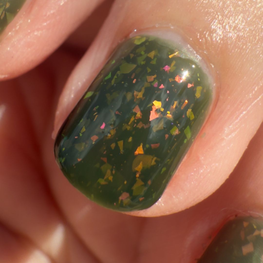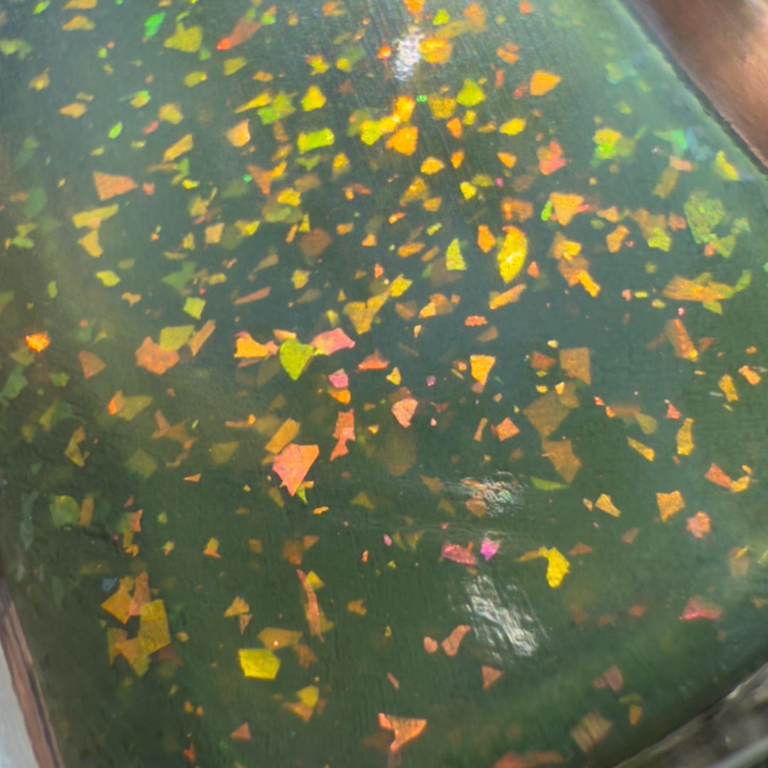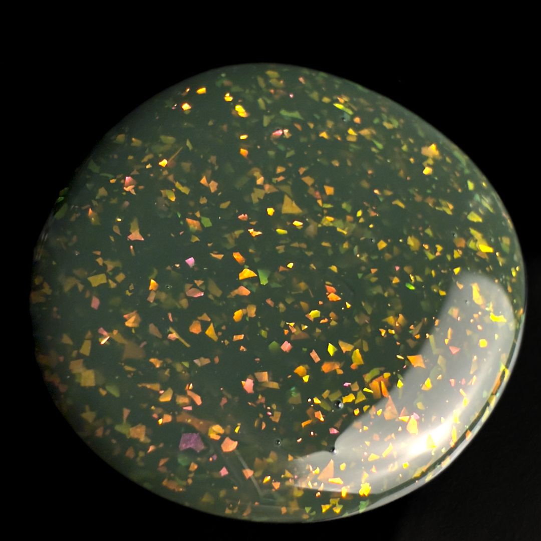 Clivia is known for its bold green foliage and striking orange blooms that appear in shadowed places. This shade is a forest green jelly alive with flakes that spark green, gold, orange, red, and fuchsia. Rooted and vibrant, Clivia celebrates resilience and the strange beauty that thrives when least expected.