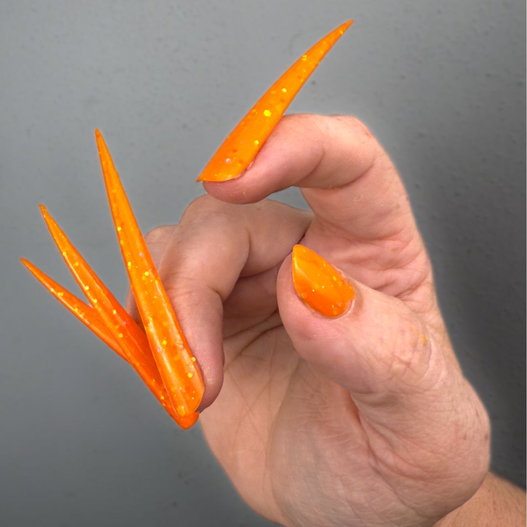 Get ready to sweeten your spooky season with this neon orange crelly polish that’s as adorable as it is delicious! Packed with iridescent, white, yellow, and orange glitters, it’s the ultimate treat for your tips—just like candy corn, but with zero calories and all the glamour. Whether you're trick-or-treating or just craving some fall fun, this polish will have everyone saying, "You’re so corny!"