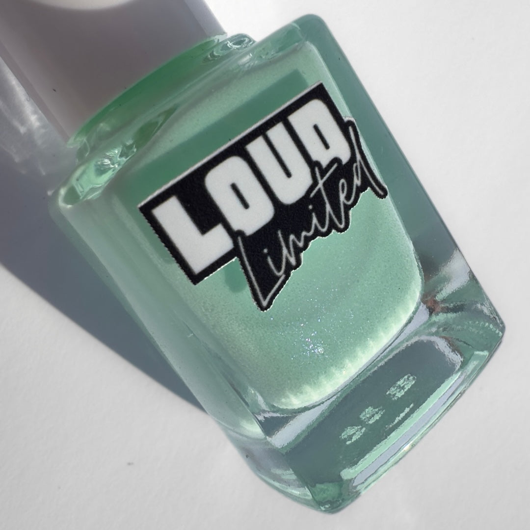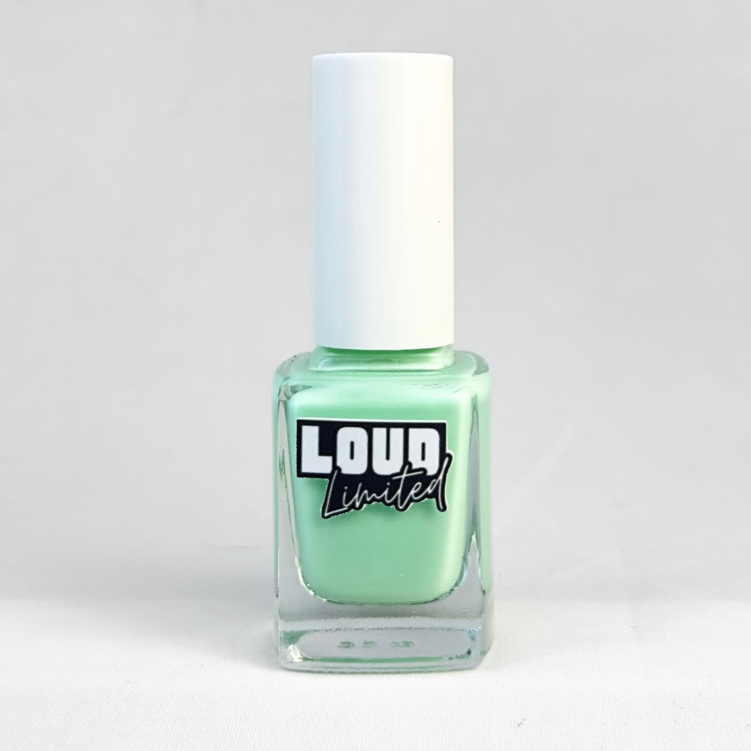 This formula is different than LOUD Lacquers. It is a neon, which means it is black light reflective, and also 9 free. It is also a pastel with added fun, and tend to run a little thicker to achieve the pizazz. Best in two coats with a top coat.