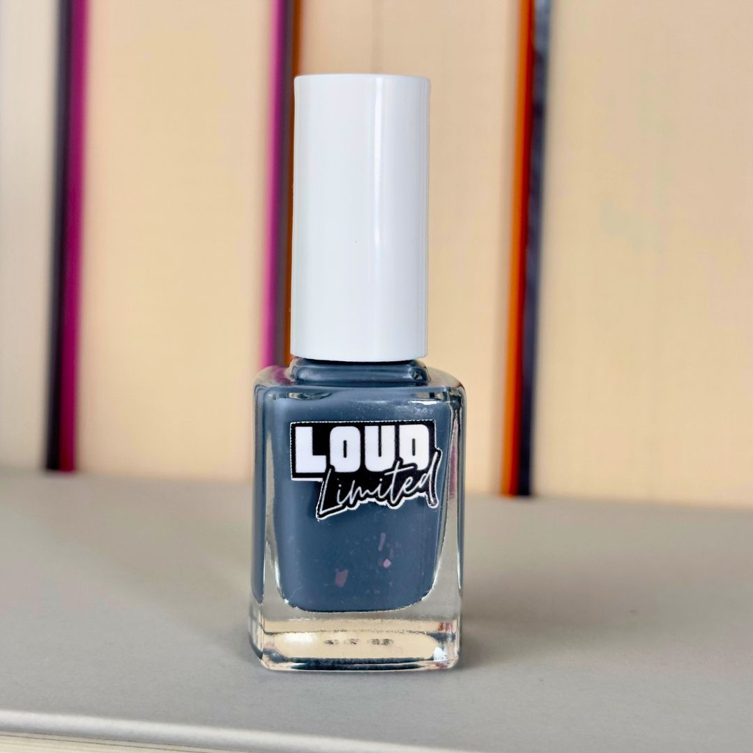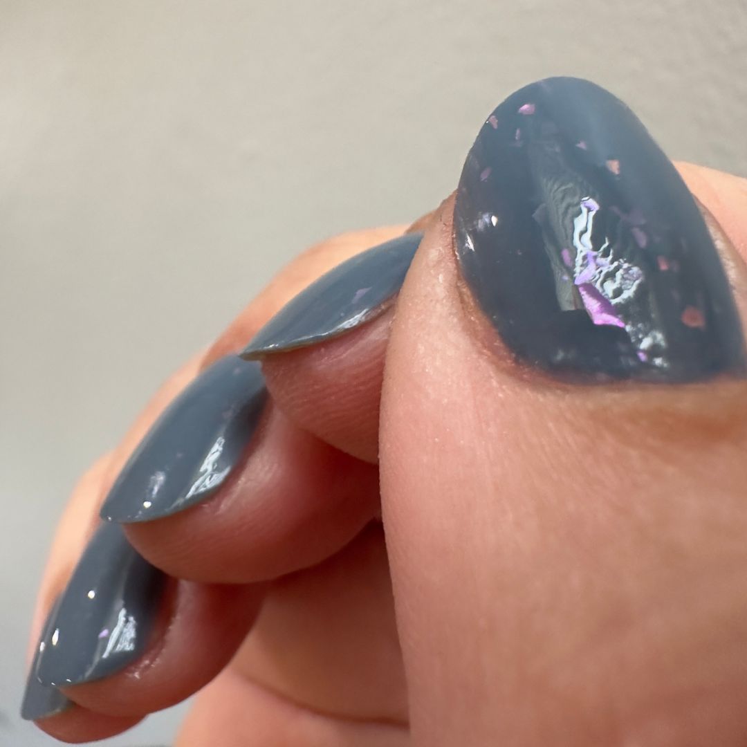 A moody stormy blue-grey crelly nail polish with multi-chrome flakes that shift from orange to red to purple to blue—just like the unexpected warmth that shines through even the grumpiest exterior. The deep, cool base embodies a brooding, introspective vibe, while the vibrant, shifting flakes capture the playful energy of sunshine that refuses to be dimmed. As the colors change with every angle, this polish brings together the contrast of dark and light, perfectly reflecting the balance of opposites in a love story where warmth always breaks through.
