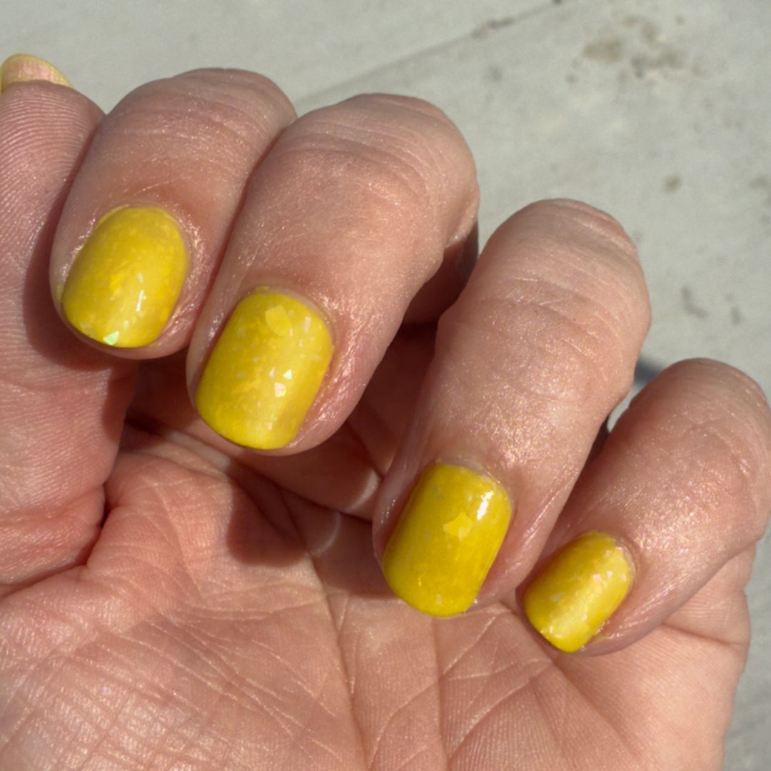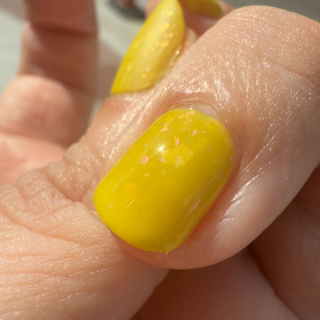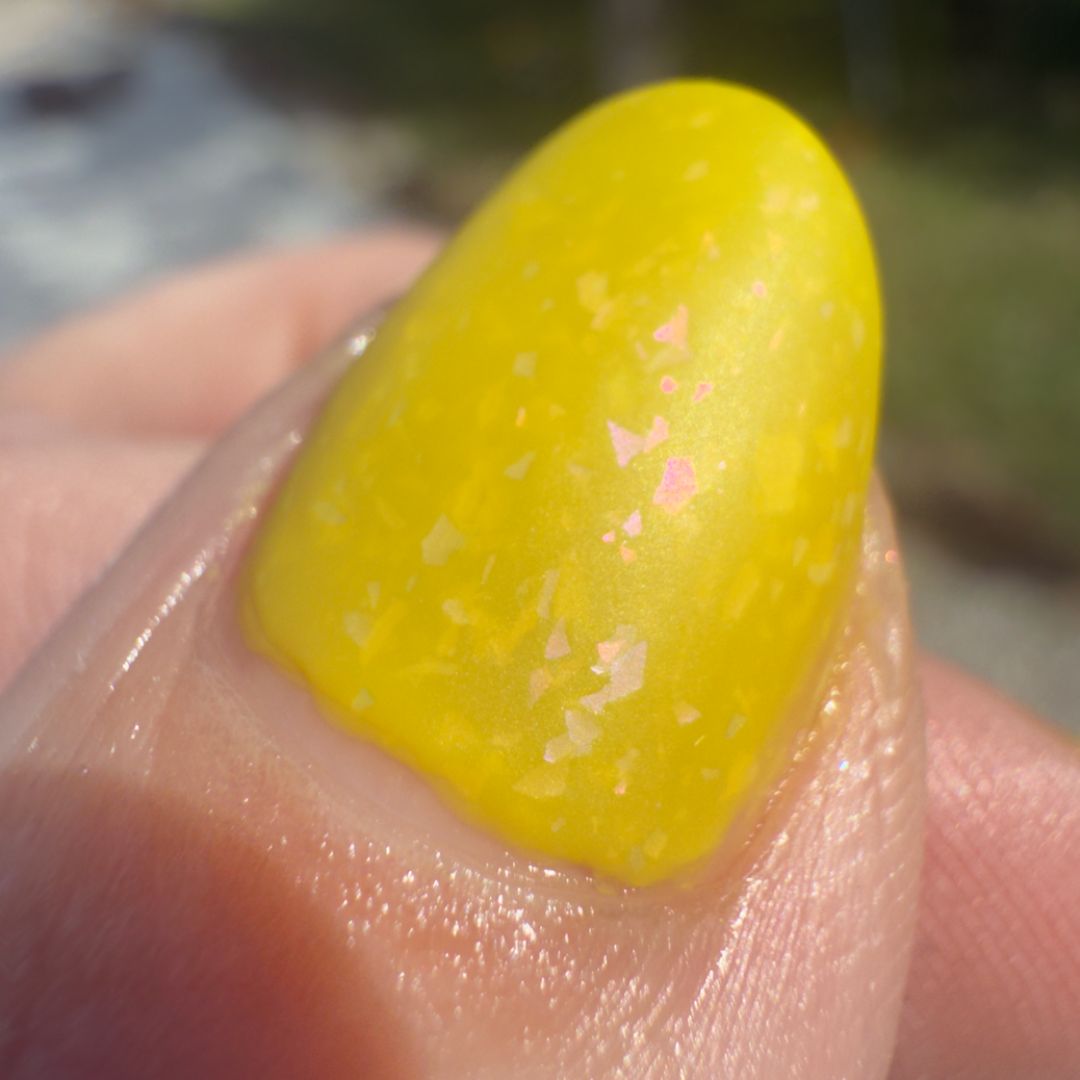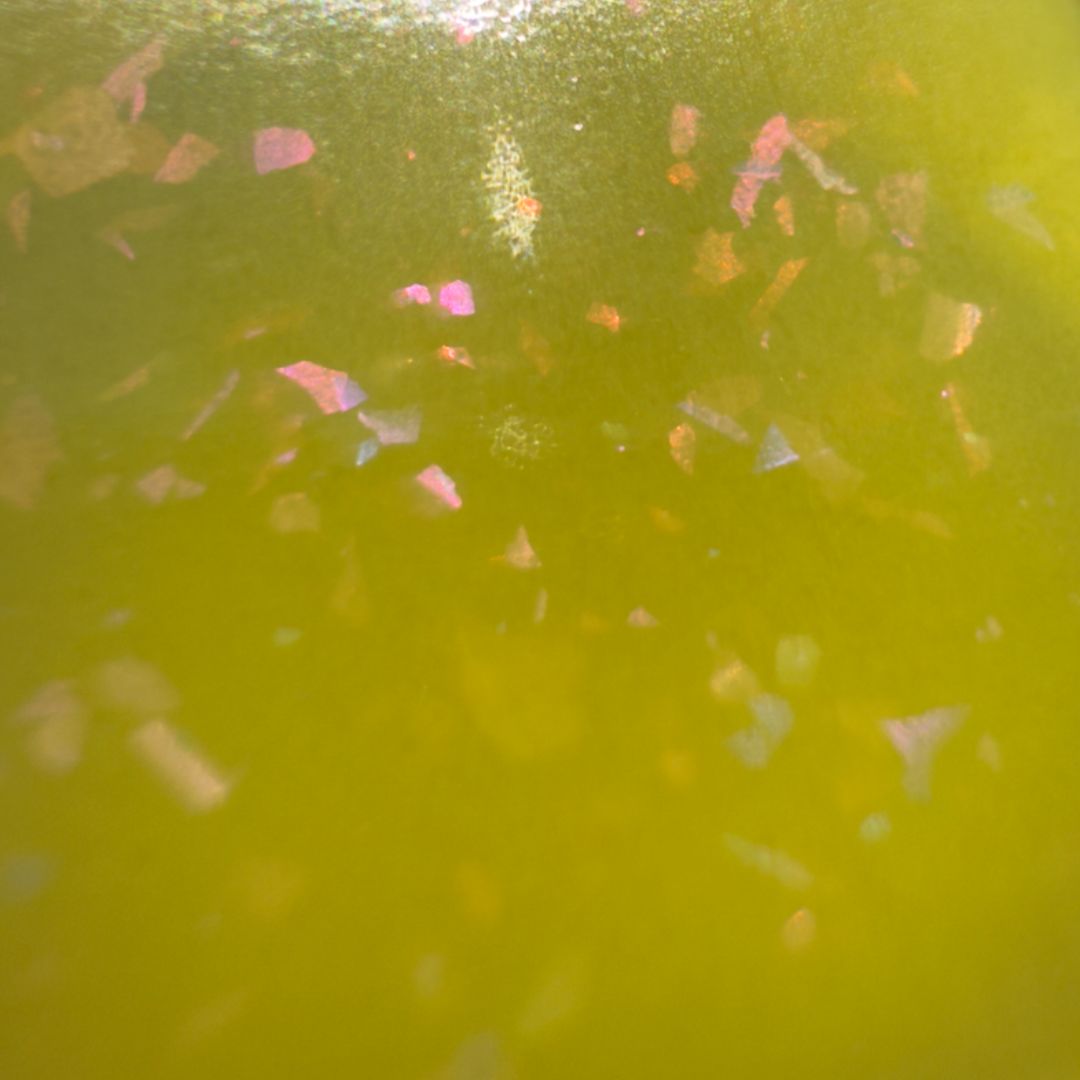 Hellebore is often called the winter rose because it dares to bloom when the world is still cold and barren. This chartreuse jelly glows with aurora flakes that shift violet, pink, blue, and red. It is a strange and luminous color that reminds us beauty can push through even the hardest seasons.