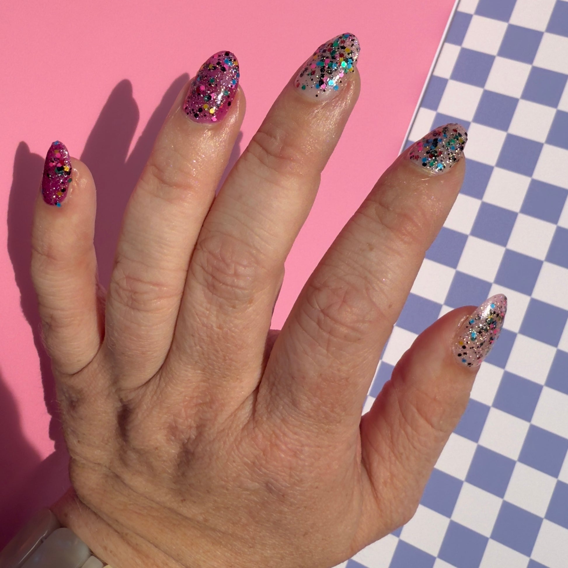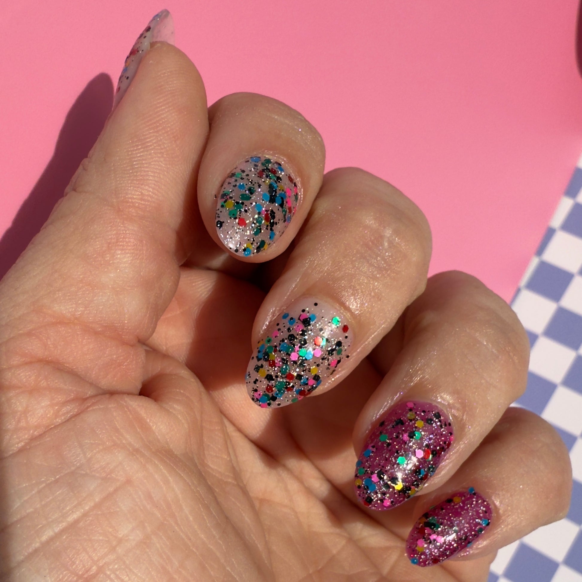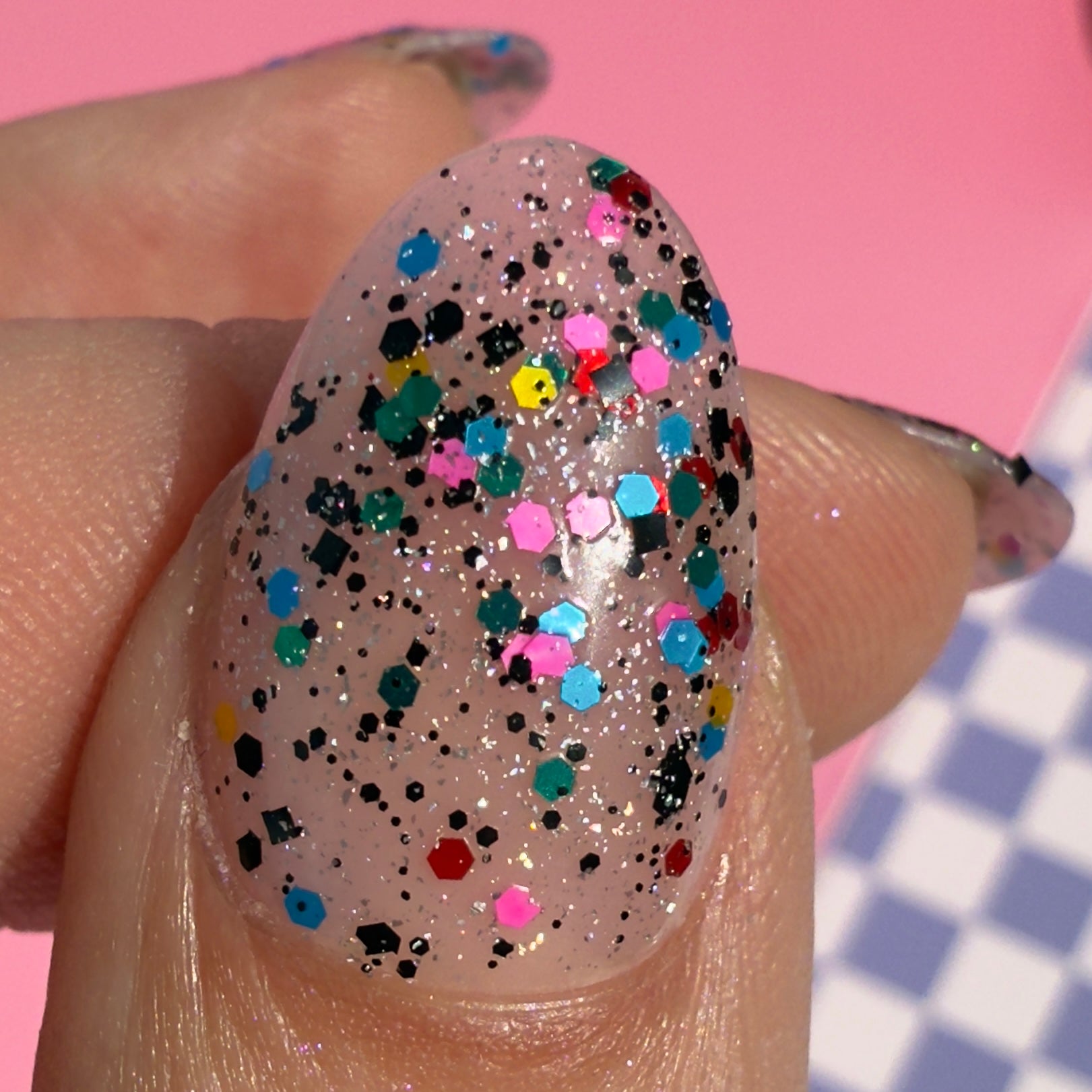 Layers of love is a colorful, confetti-splattered topper packed with holo flakes, bold black glitter mix, and bright hex glitters in yellow, green, blue, pink & red because love comes in every shade. $5 from every bottle goes directly to Celebration Nation, a nonprofit supporting Latino farm workers and their families, in collaboration with @littlepandapit. Leslie chose this cause to highlight the people who nourish our communities and to layer love, color and compassion right into your nails. This one is LOUD, proud and sprinkled with purpose.