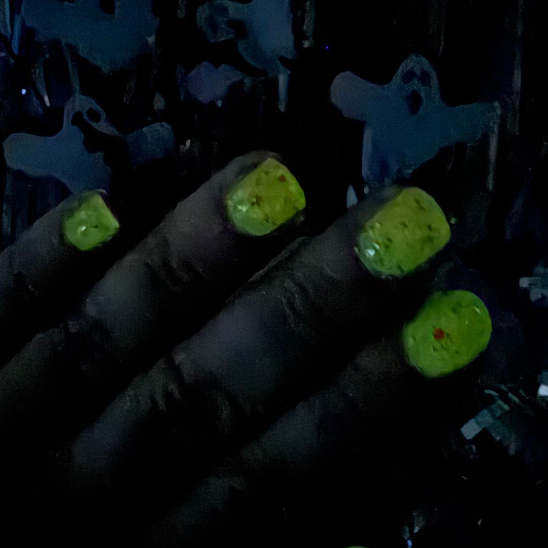 This pastel orange potion is like candy corn’s cooler cousin! Pumpkin Pop glows in the dark with a soft, pumpkiny glow and is packed with a playful mix of hex glitters in orange, pink, teal, and glow-in-the-dark green. To top it off, tiny opal flakes and sprite sparkles swirl through the polish, adding an iridescent twinkle that makes your nails feel like a pastel jack-o-lantern party. Sweet, spooky, and ready to light up the night!