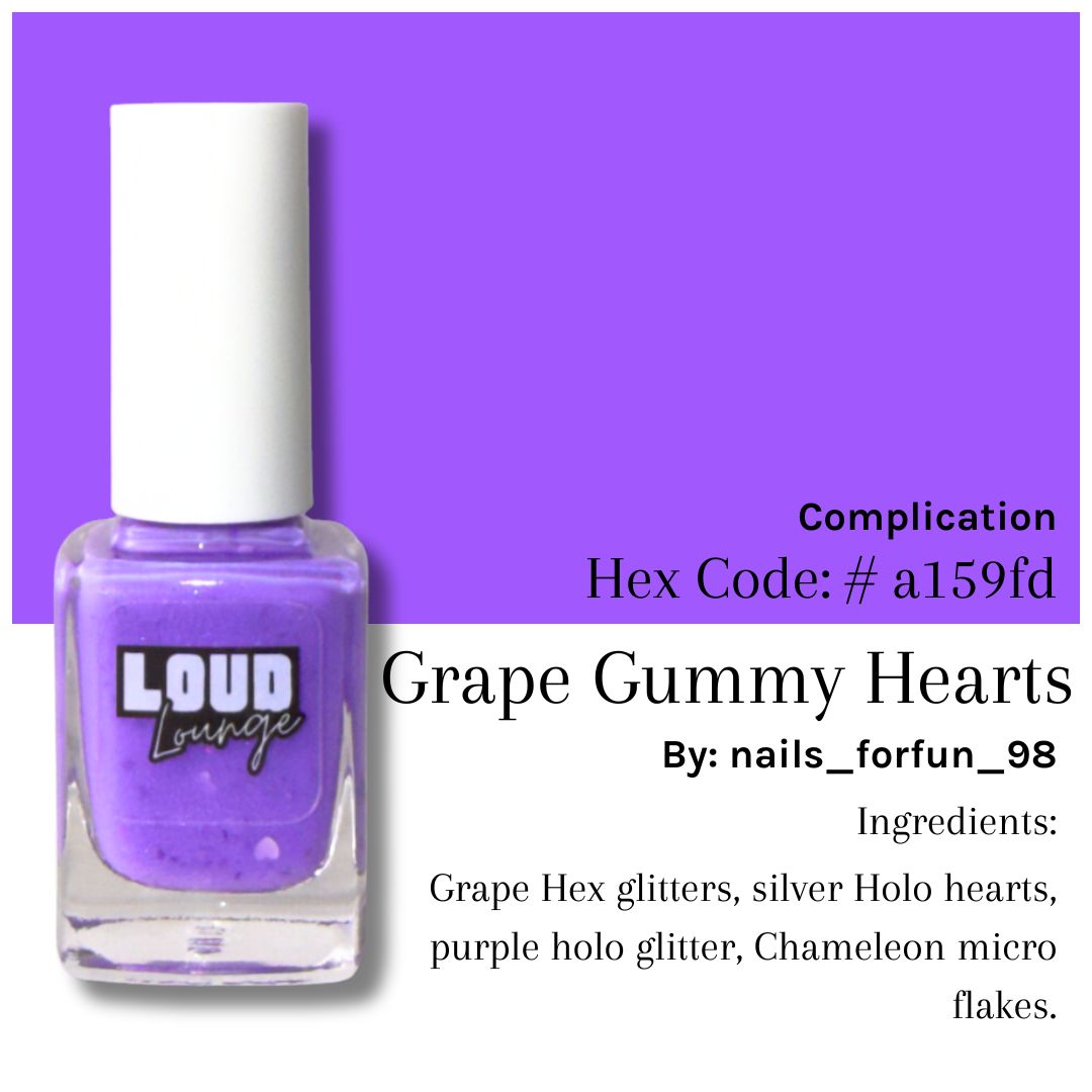 Ingredients: Grape Hex glitters, silver Holo hearts, purple holo glitter, Chameleon micro flakes.