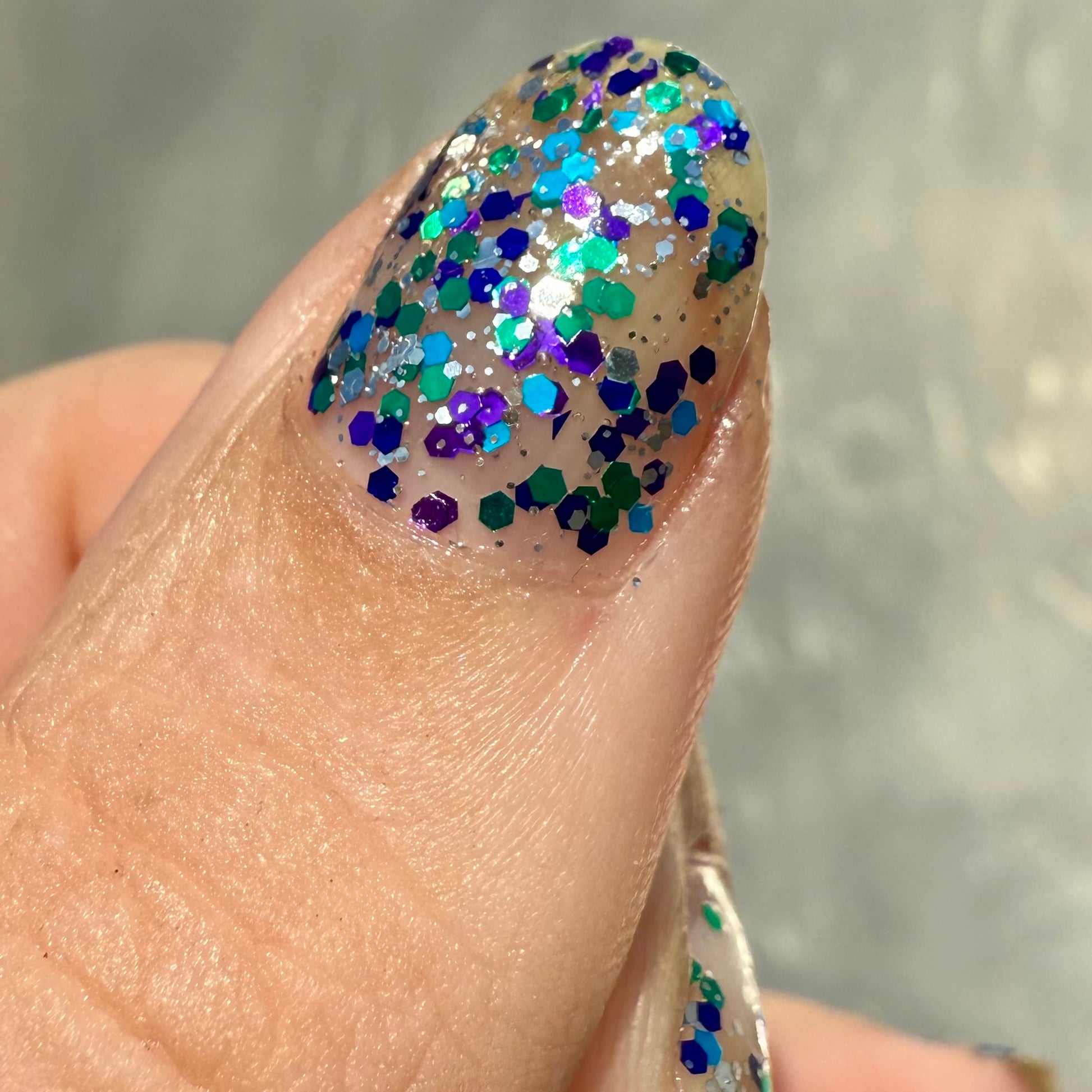 Smile : ) is a splatter topper made up of silver, neon blue, sapphire blue, green, and purple hexes in a clear base. These are the colors our survivor BABB wears proudly. Find your bead color to show your support and wear it under smile.