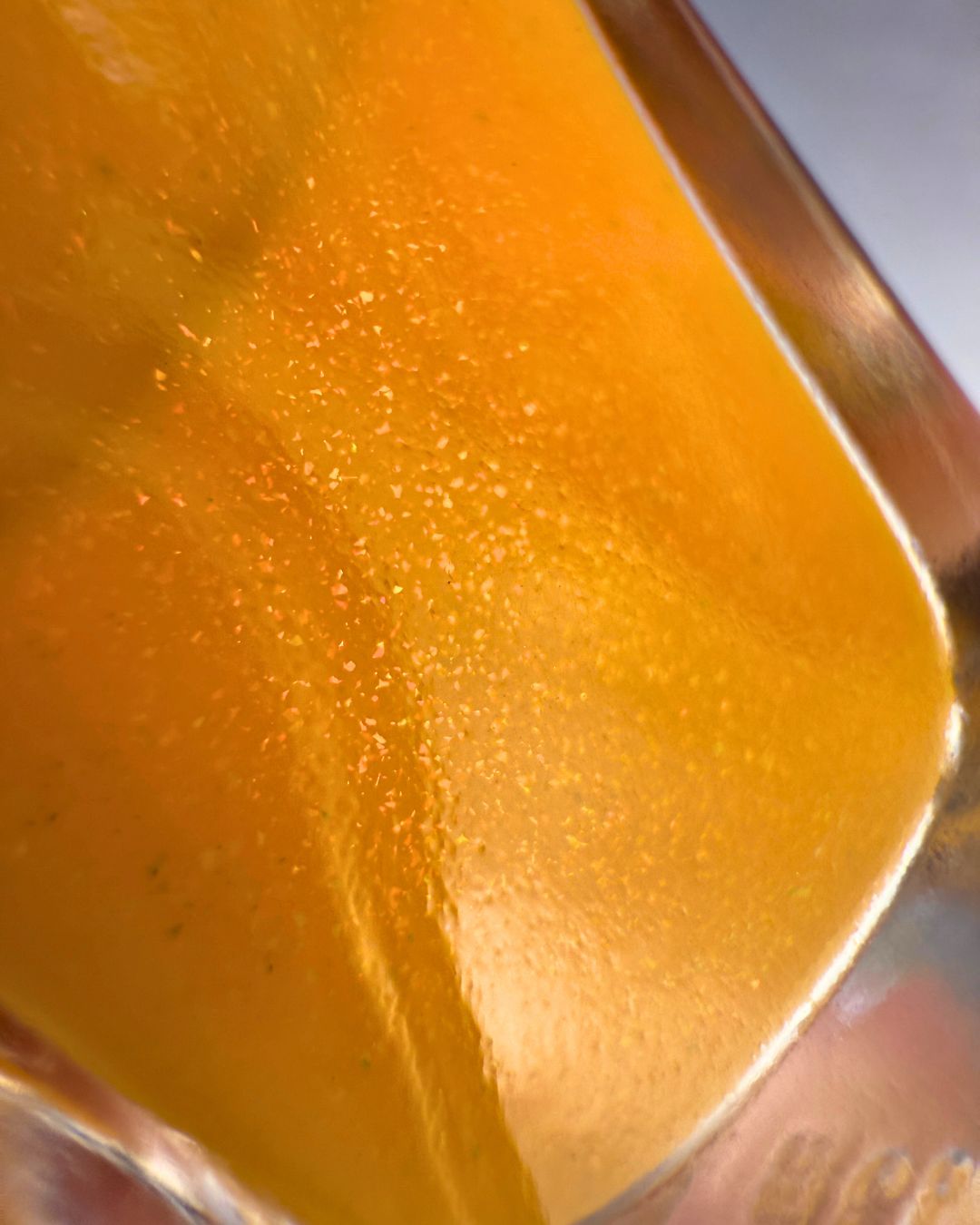 Tangy-Fingies is a tangerine jelly with color-shifting micro flakes that flash green, gold, and pink. This juicy, squishy formula builds up in 2-3 thin coats, giving a playful peek at your natural nail line beneath a wash of sunny citrus.