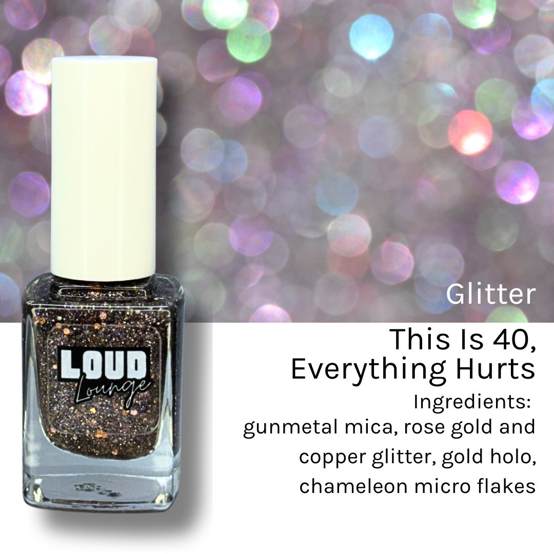 Ingredients: gunmetal mica, rose gold and copper glitter, gold holo, chameleon micro flakes