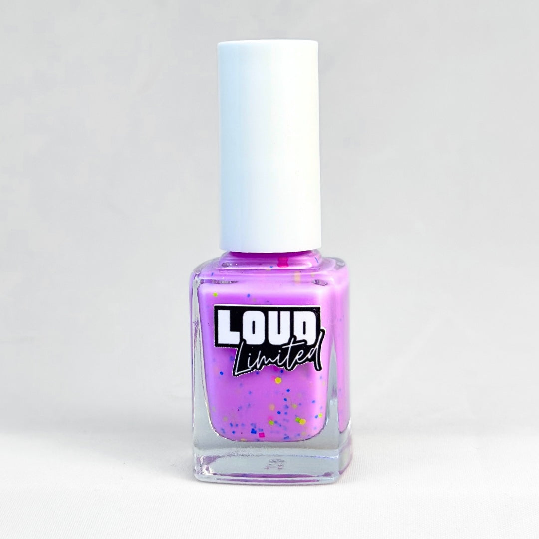 This formula is different than LOUD Lacquers. It is a neon, which means it is black light reflective, and also 9 free. It is also a pastel with added fun, and tend to run a little thicker to achieve the pizazz. Best in two coats with a top coat. She's a beaut, trust!