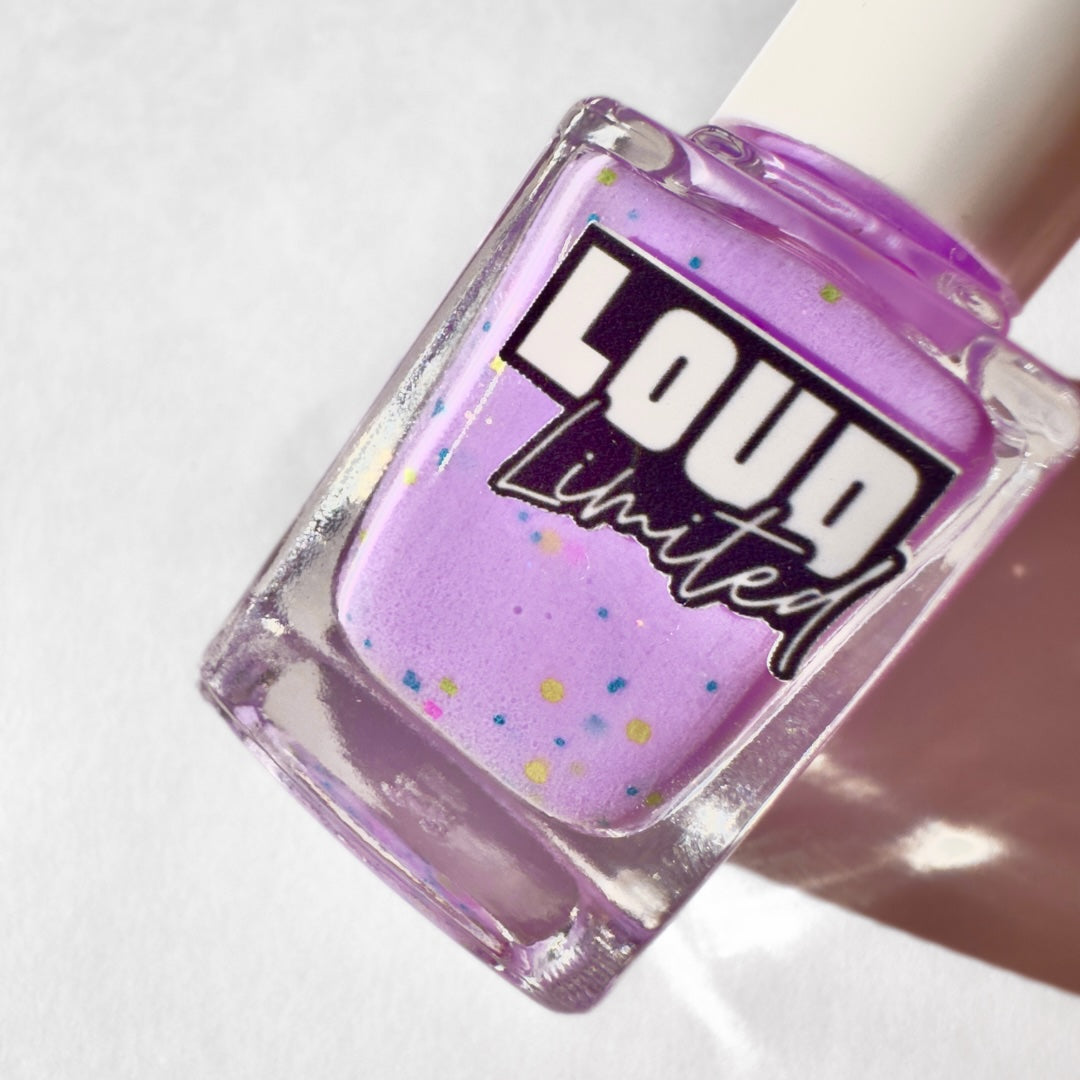 Too many tabs, too many thoughts. Sometimes you want it all and this flirty nail polish has a bit everything. It's a neon pastel purple crelly with a neon hex glitter mix 💙🩷💛💚 with a little added spice in the form of holo micro hexes.