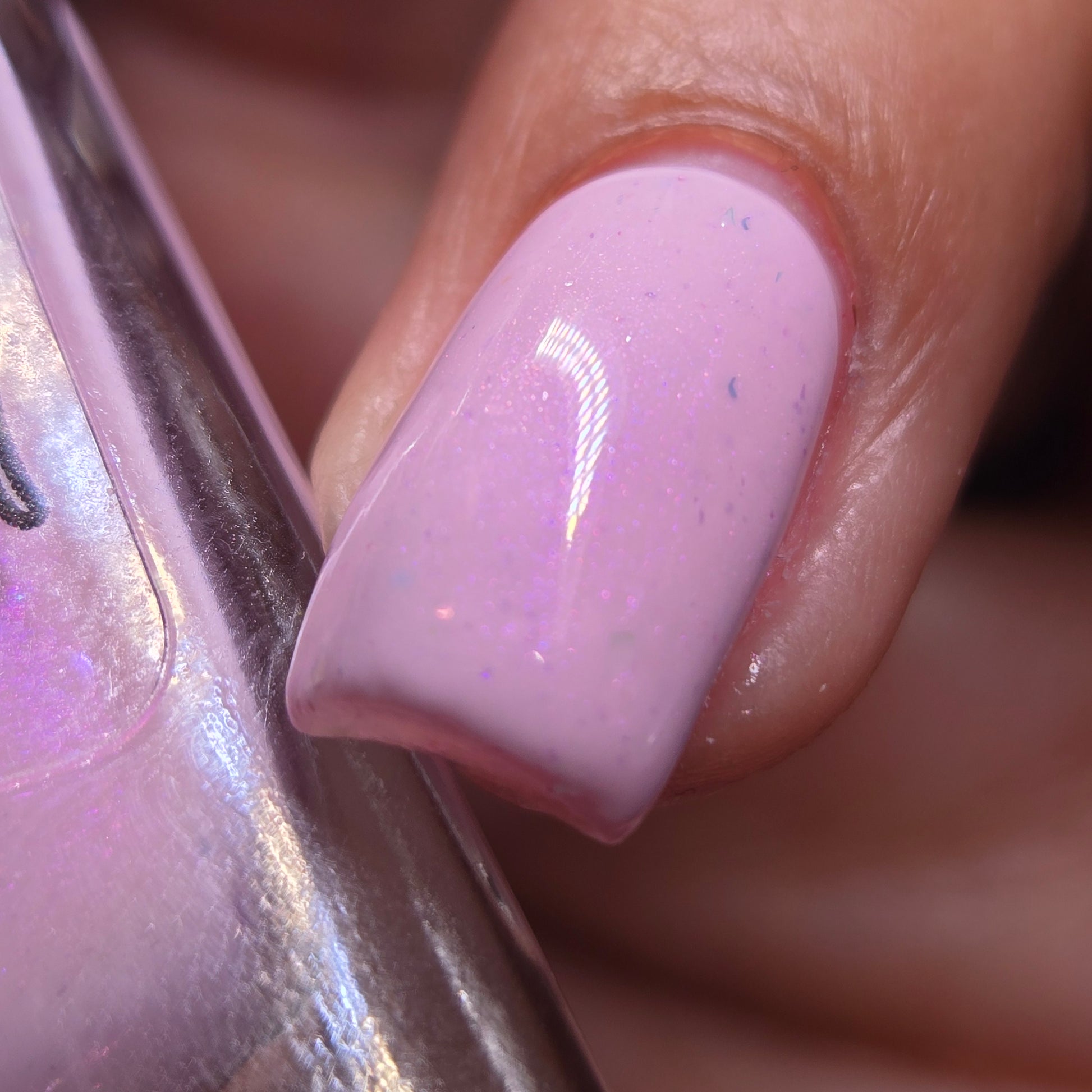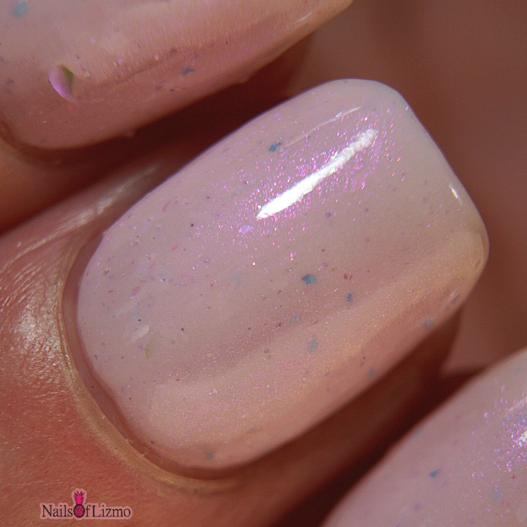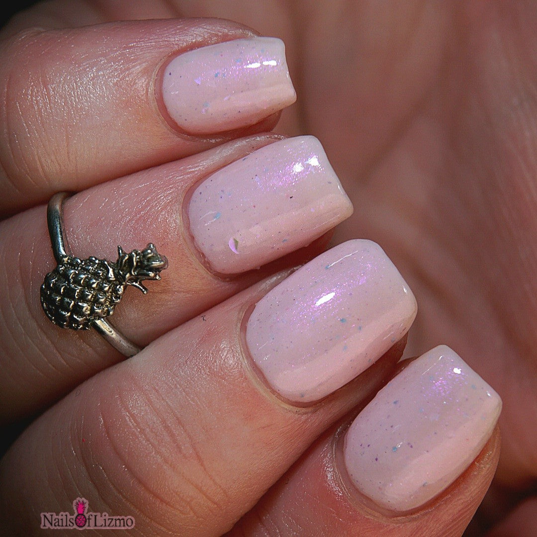 A soft blush pink with glowing aurora flakes, a violet aura shimmer, and delicate blue, pink, and lavender microflakes—because if everything’s falling apart, your nails might as well look flawless. It’s giving “this is fine” energy, but at least you’re doing it in style.
